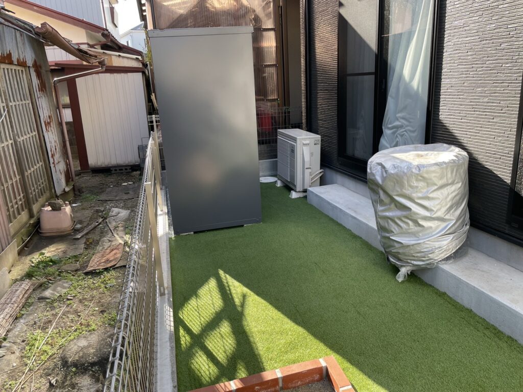 物置と人工芝の地面の高さを合わせつつ、「物置の前はしっかり通れる幅の人工芝通路を確保」「室外機周りもきれいにカットして、メンテナンスもしやすい」ようにレイアウトしました。「物置を置きたいけれど、通路が狭くなりそう…」という方も、人工芝と同時に動線計画をしておくことで、使いやすさが大きく変わります。