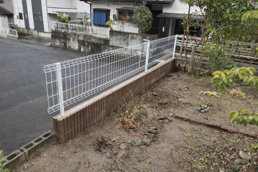 今回の現場では、化粧ブロックで土留め・境界のラインを整えたうえで、フェンスを設置しています。