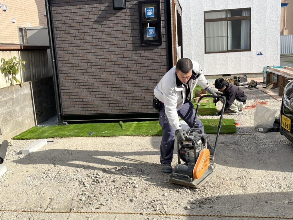 • alt:砕石下地の転圧作業(沈みを防ぐ施工)|人工芝の下地工事