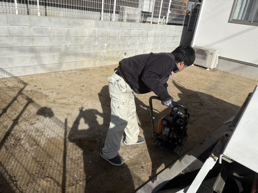 • キャプション:整地後に転圧。下地を締めるほど、沈み・凹みが出にくくなります。