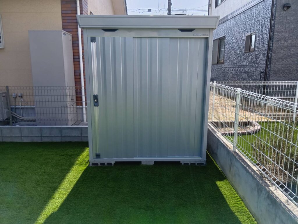 今回の施工では、人工芝のスペースに物置を設置しています。
